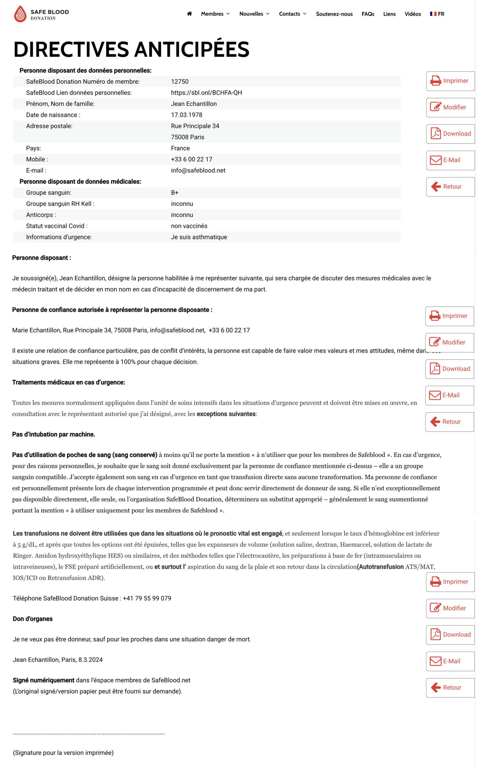 Ceci est un exemple de testament de vie. Si vous souhaitez avoir le vôtre, rendez-vous sur la page « connexion » en tant que membre ici, où vous pourrez modifier cet exemple comme vous le souhaitez. Vous pouvez également devenir membre « ici« . Vous disposerez alors non seulement de votre propre testament de vie et de votre carte d’identité de membre ou de groupe sanguin, mais aussi d’un code individuel que le personnel médical pourra appeler en cas d’urgence – avec toutes vos données médicales.