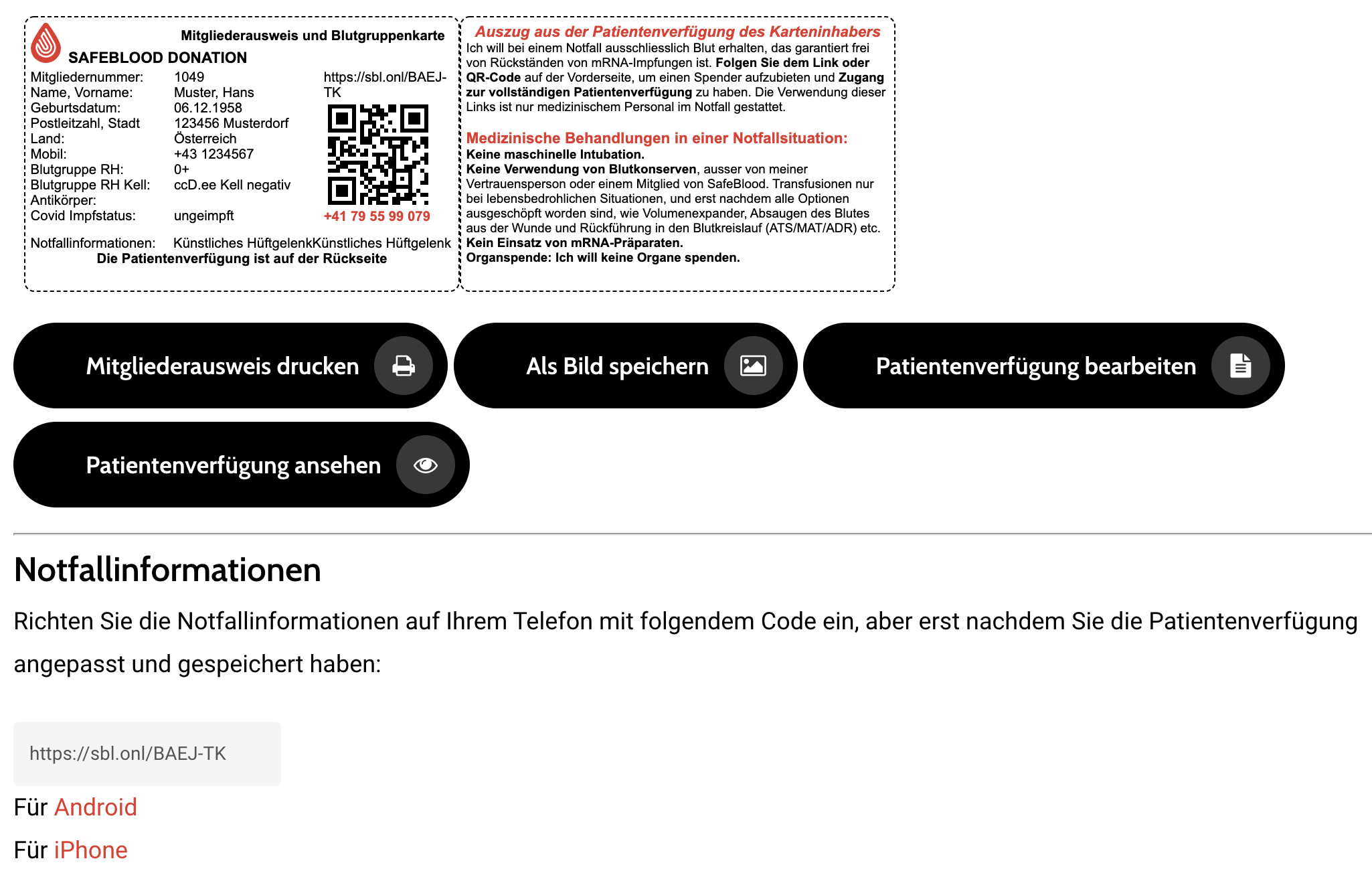 Der QR-Code und der darüberstehende Link ist ebenfalls für das medizinische Notfallpersonal. das Scannen dieses Codes/Links führt direkt zu Ihrer Patientenverfügung und allen relevanten medizinischen Daten, und zwar in einer speziellen Version nur für das Fachpersonal, das dort die Option findet, diese Daten in wenigen Sekunden in die wichtigsten Weltsprachen übersetzen zu können.