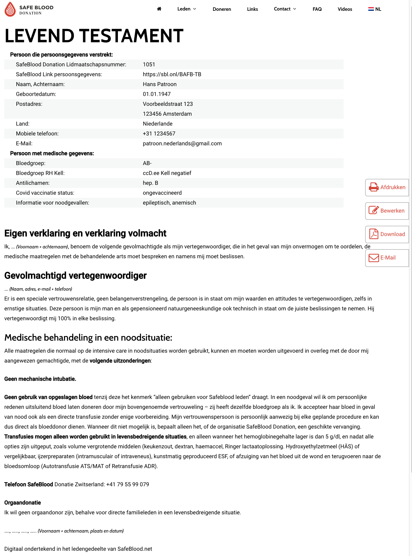 Dit is een voorbeeld van een levenstestament. Als u uw eigen exemplaar wilt, ga dan naar de “login” als lid hier, waar u dit monster naar believen kunt veranderen. Of u kunt “hier” lid worden. Dan heb je niet alleen je eigen levenstestament en je ledenpas/bloedgroepkaart, maar ook een individuele code die medisch personeel in geval van nood kan oproepen – met al je medische gegevens.