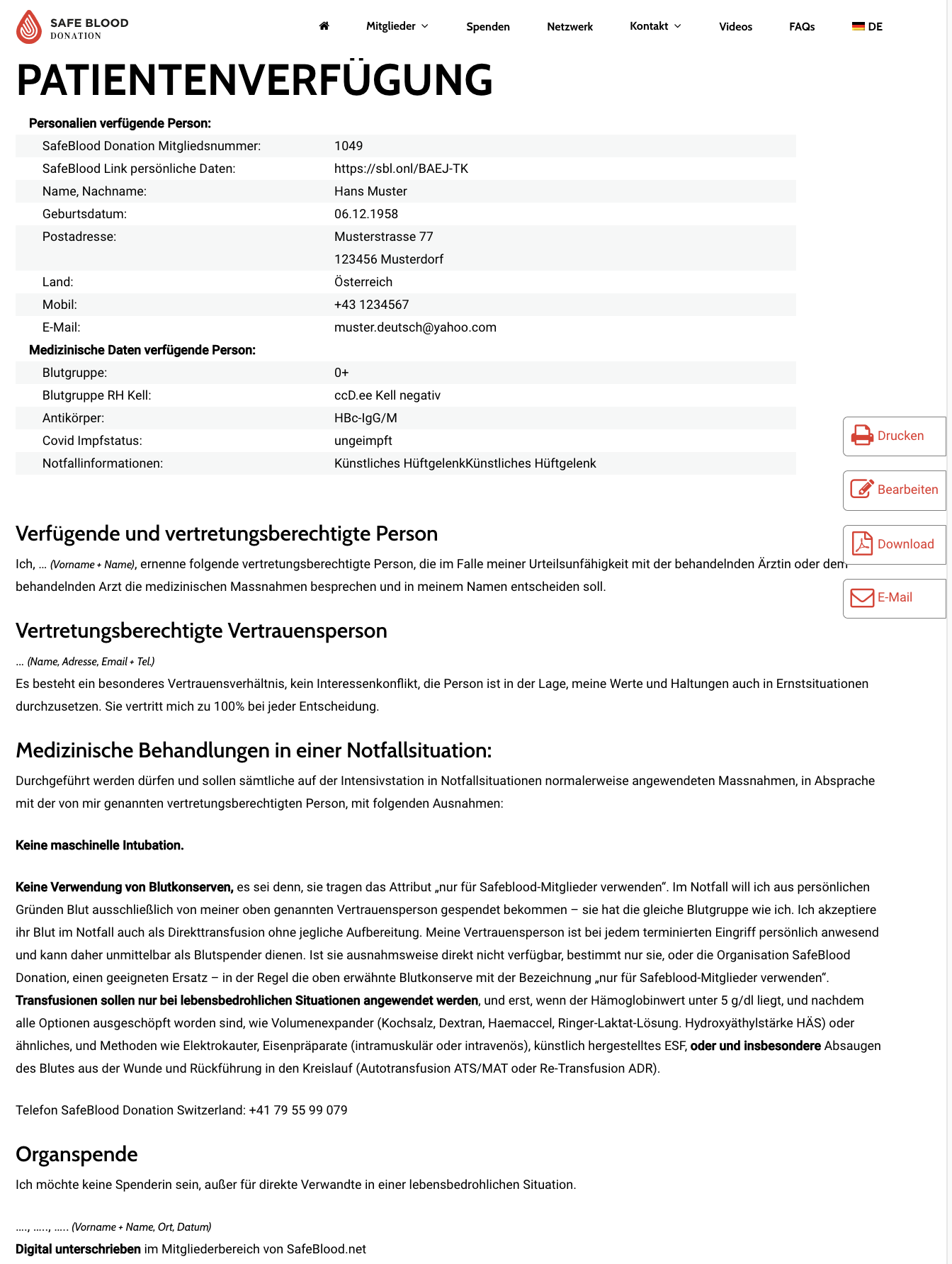 Das ist ein Muster einer Patientenverfügung. Wollen Sie Ihre eigene, geht’s als Mitglied hier zum “login“, wo Sie dieses Muster beliebig verändern können. Oder Sie werden “hier” Mitglied. Dann haben Sie nicht nur Ihre eigene Patientenverfügung und Ihren Mitgliederausweis/Blutgruppenkarte, sondern auch einen individuellen Code, den das medizinische Personal bei einem Notfall abrufen kann – mit all Ihren medizinischen Daten.
