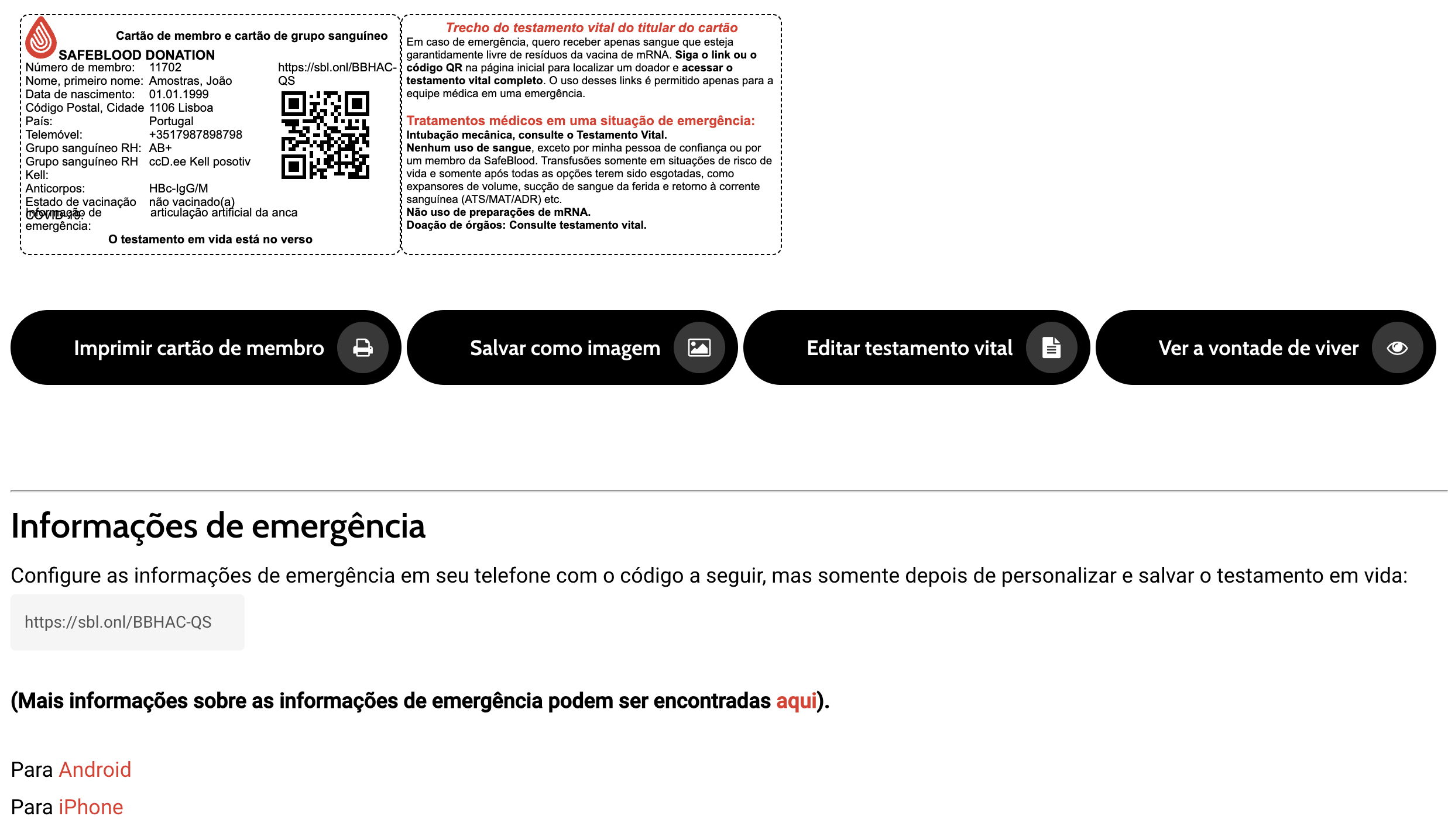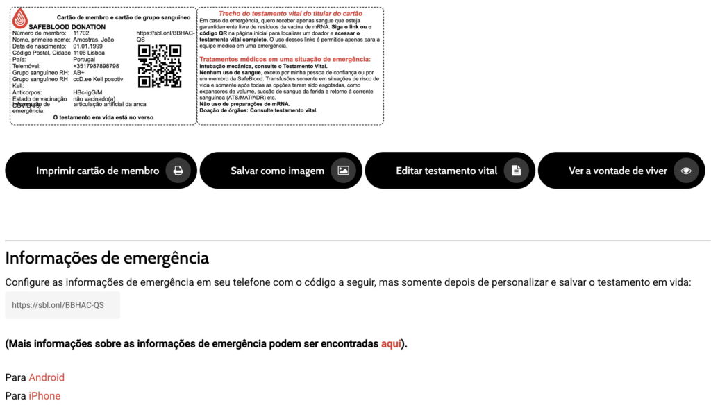 O código QR e a ligação acima indicados são também para o pessoal médico de emergência. A digitalização deste código/link irá levá-los directamente ao seu testamento vital e a todos os dados médicos relevantes, numa versão especial apenas para profissionais, que encontrarão aí a opção de traduzir estes dados para as principais línguas mundiais em poucos segundos.