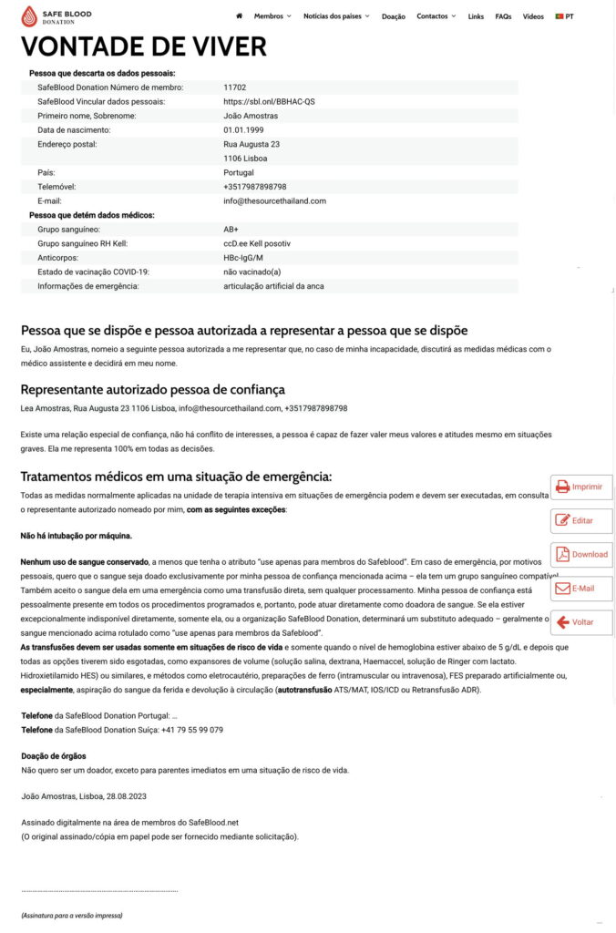 Esta é um exemplo de um testamento vital. Se quiser um seu, aceda ao login como membro, onde pode modificar este documento como desejar. Ou pode tornar-se um membro aqui. Assim, não só terá o seu próprio testamento e cartão de membro/grupo sanguíneo, como também um código individual que o pessoal médico pode utilizar em caso de emergência – com todos os seus dados médicos.
